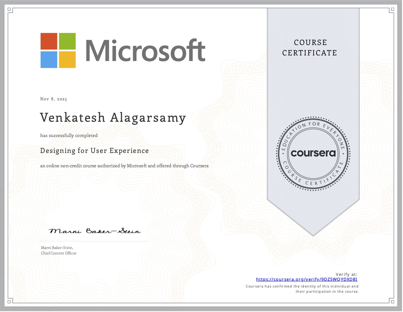 - Linkedin -"I had a chance to work with Venkatesh Alagarsamy with multiple Microsoft projects . He is a very good creative, hard working, UX/HTML/CSS designer. He made lot of Web developers job easy by handling complex animations with his exceptional CSS skills. I would recommend working with him in future again."